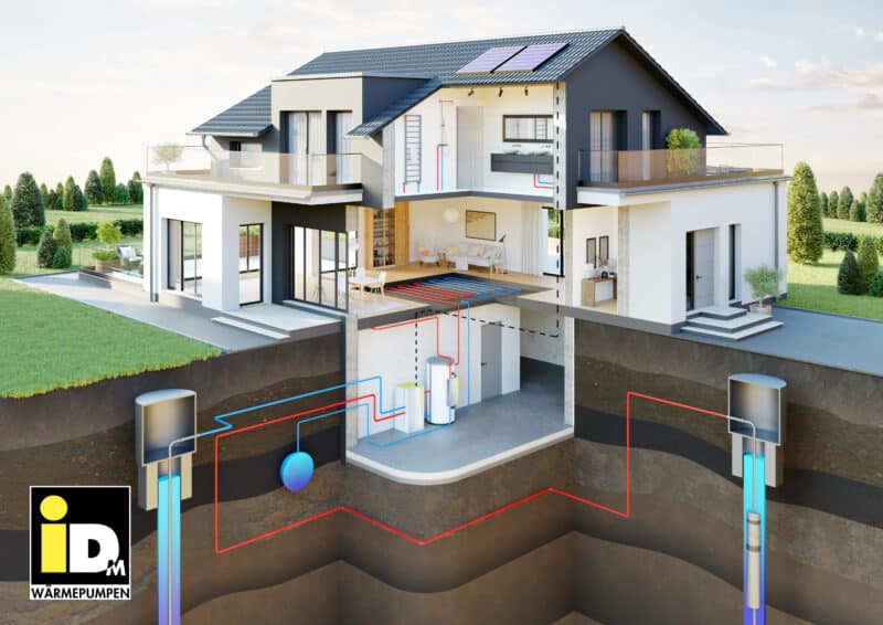 Vodní tepelná čerpadla iDM využívají teplo přímo z podzemní vody pomocí dvou studní – jedna slouží pro odběr a druhá pro návrat vody zpět do podzemí.